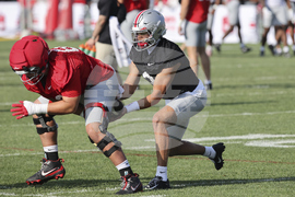 Ohio State offensive lineman Julian Goines-Jackson, left, and Joshua Padilla participate in a drill during NCAA college football practice in Columbus, Ohio, Friday, Aug. 1, 2025. (AP Photo/Paul Vernon)