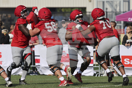 Ohio State offensive lineman Justin Terry, left, Gabe VanSickle, Jayvon McFadden, and Phillip Daniels participate in a drill during NCAA college football practice in Columbus, Ohio, Friday, Aug. 1, 2025. (AP Photo/Paul Vernon)