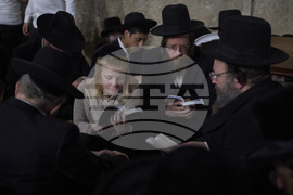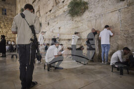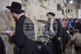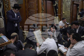 Ultra-orthodox Jewish men pray during the mourning ritual of Tisha B'Av at the Western Wall, Judaism's holiest site, in Jerusalem's Old City, Saturday, Aug. 02, 2025. (AP Photo/Ohad Zwigenberg)