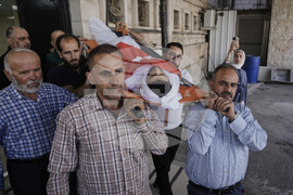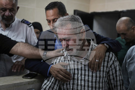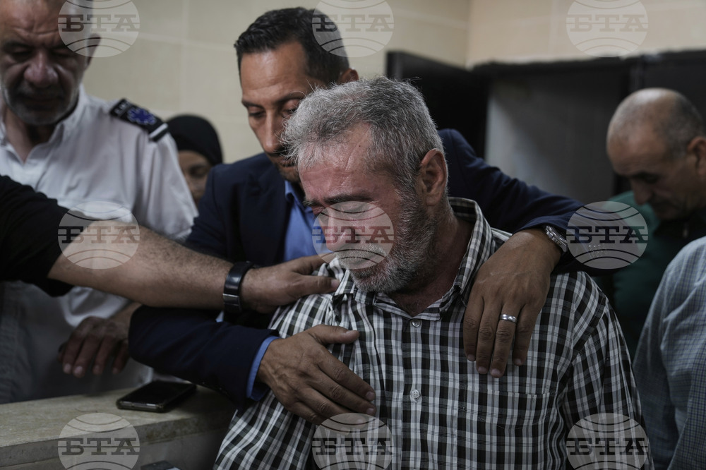 Mourners gather at a hospital in Nablus, West Bank, Sunday, Aug. 3, 2025, for the funeral of Mu'in Asfar, 24, a Palestinian killed during clashes with Israeli settlers in the village of Aqraba. (AP Photo/Majdi Mohammed)