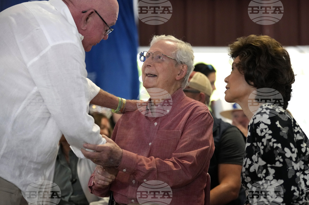 Sen. Mitch McConnell, R-Ky., left, walks to the podium to speak as he is applauded by his wife, Elaine Chao, second from right, at the annual Fancy Farm picnic Saturday, Aug. 2, 2025, in Fancy Farm, Ky. (AP Photo/Mark Humphrey)