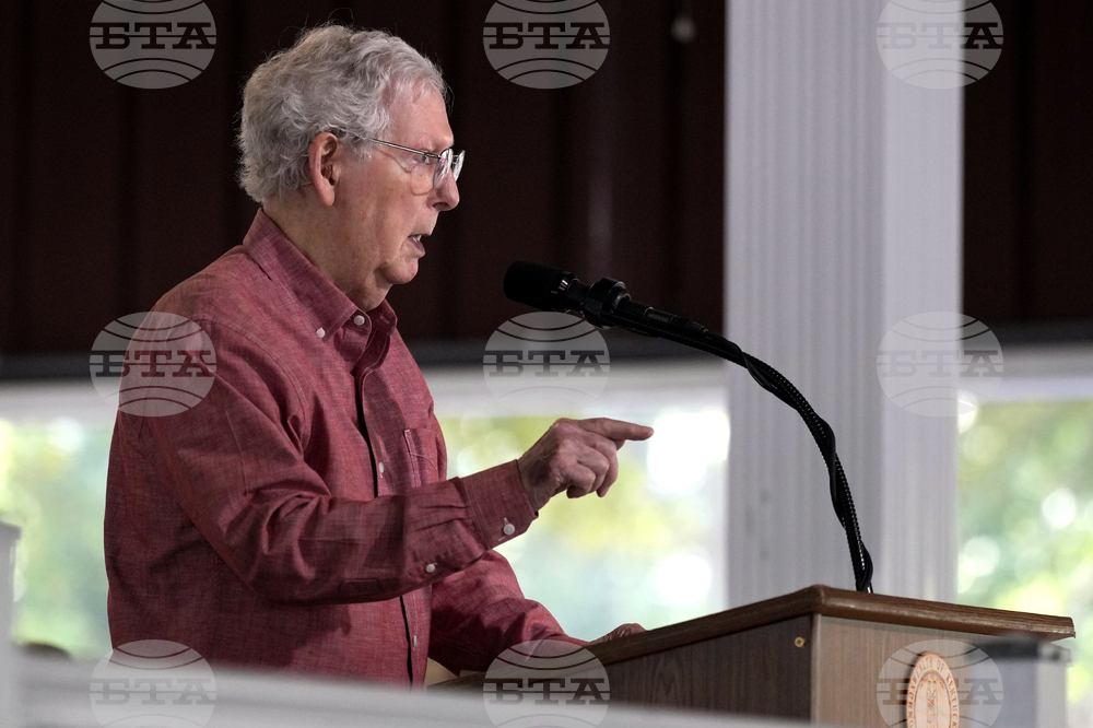 Sen. Mitch McConnell, R-Ky., left, walks to the podium to speak as his wife, Elaine Chao, second from right, looks on at the annual Fancy Farm picnic Saturday, Aug. 2, 2025, in Fancy Farm, Ky. (AP Photo/Mark Humphrey)