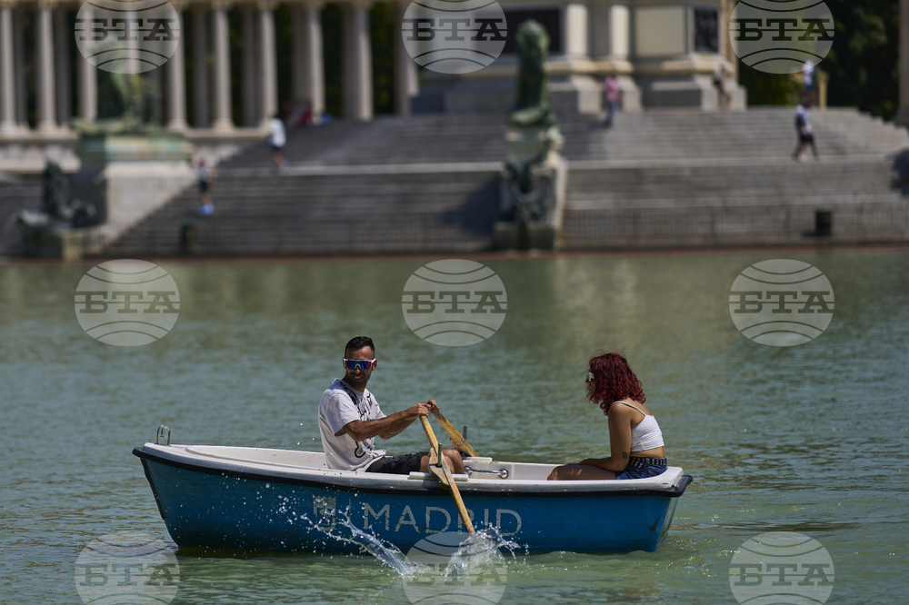 A man rows a pleasure boat in the Retiro park during hot weather in Madrid, Spain, Monday, Aug. 4, 2025. (AP Photo/Manu Fernandez)