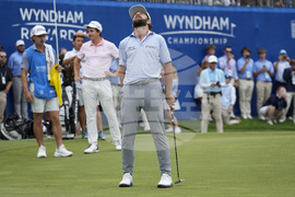 Cameron Young, center, reacts after missing a putt on the 18th hole before winning the Wyndham Championship golf tournament in Greensboro, N.C., Sunday, Aug. 3, 2025. (AP Photo/Chuck Burton)