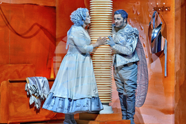 This image released by Bayreuth Festival shows Elsa von Brabant, left, and tenor Piotr Beczala during a dress rehearsal of the 2025 revival of Yuval Sharon's production of Wagner's "Lohengrin" at the Bayreuth Festival on July 13, 2024. (Enrico Nawrath/Bayreuth Festival via AP)