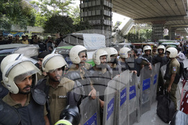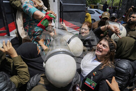 Police officers block supporters of Pakistan's imprisoned former Prime Minister Imran Khan's party for holding a protest marking second anniversary of Khan's incarceration, in Lahore, Pakistan, Tuesday, Aug. 5, 2025. (AP Photo/K.M. Chaudary)