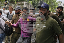 Plainclothes police officers detain a supporter, centre, of Pakistan's imprisoned former Prime Minister Imran Khan's party who with others gathered for a protest marking second anniversary of Khan's arrest, in Karachi, Pakistan, Tuesday, Aug. 5, 2025. (AP Photo/Fareed Khan)