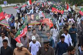 Supporters of Pakistan's imprisoned former Prime Minister Imran Khan's party take part in a rally in Hyderabad, Pakistan, Tuesday, Aug. 5, 2025, demanding his release and marking second anniversary of Khan's arrest. (AP Photo/Pervez Masih)