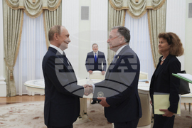 Russian President Vladimir Putin, left, and U.S. President Donald Trump's special envoy Steve Witkoff, right, shake hands during their meeting at the Kremlin in Moscow, Russia, Wednesday, Aug. 6, 2025. (Gavriil Grigorov, Sputnik, Kremlin Pool Photo via AP)