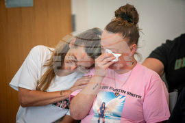 Diana Allen, mother of Charity Perry, comforts Melissa Smith, mother of Kristin Smith, during a news conference at the Multnomah County Courthouse in Portland, Ore. on Tuesday, Aug. 5, 2025. (Mark Graves/The Oregonian via AP)