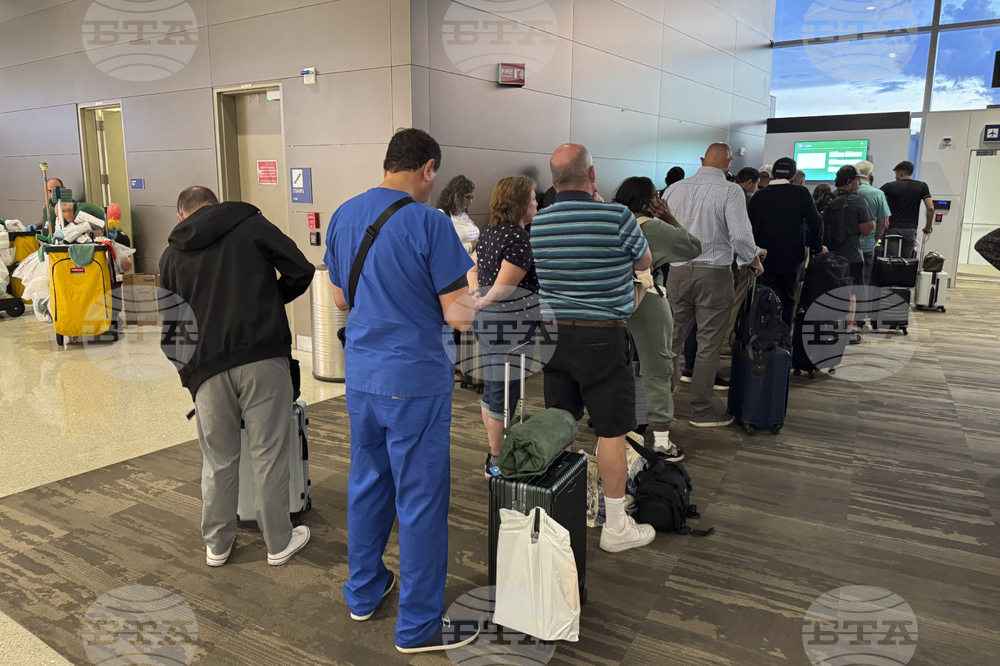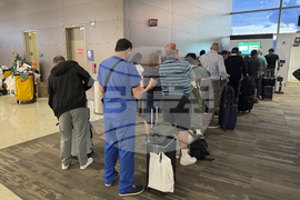 Passengers seeks updates on their delayed flight at Louis Armstrong New Orleans International Airport, Wednesday, Aug. 6, 2025, in Kenner, La. (AP Photo/Jack Brooks)