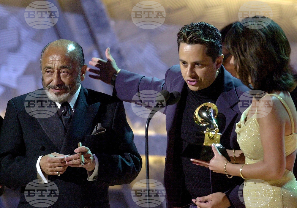FILE - Tito Puente Jr., center, speaks after Eddie Palmieri, left, and the late Tito Puente win the Grammy for best salsa album for "Masterpiece/Obra Maestra," at the 43rd annual Grammy Awards, Feb. 21, 2001, at the Staples Center in Los Angeles. (AP Photo/Kevork Djansezian, File)