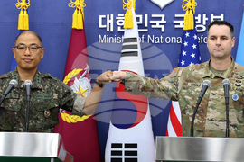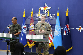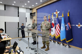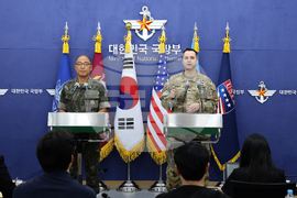 Col. Lee Sung-jun, left, public affairs director of South Korea's Joint Chiefs of Staff attends a press briefing of Ulchi Freedom Shield 2025 exercise at the Defense Ministry in Seoul Thursday, Aug. 7, 2025. (Chung Sung-Jun/Pool Photo via AP)