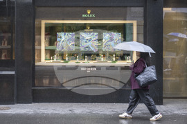 FILE - a Passer-by with umbrella in rainy weather in front of a watch shop window on Grendelstrasse in Lucerne's old town on Wednesday, 16 April 2025. (Urs Flueeler/Keystone via AP)
