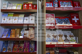 FILE - Swiss chocolate bars from the brands Favarger, Villars, Cailler and Swiss-Dream are photographed in a souvenir shop window on Thursday, 10 April 2025, in Geneva. (Martial Trezzini/Keystone via AP)