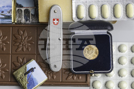 FILE - A selection of Swiss products including pocket knives, Goldvreneli coins, chocolate, cheese and medicines, are photographed on Monday, 14 April 2025 in Bern. (Christian Beutler/Keystone via AP)