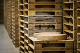 FILE - Swiss cheese "Le Gruyere" are pictured during a reception to honor the Swiss athletes at the Embassy of Switzerland in Hungary, on the side line of the World Athletics Championships, in Budapest, Hungary, Wednesday, Aug. 23, 2023. (Jean-Christophe Bott/Keystone via AP)