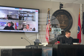 Lake County General Sessions Judge Anthony T. Cook speaks to Austin Drummond via video conference during an arraignment on Thursday, Aug. 7, 2025, in Tiptonville, Tenn. (AP Photo/Adrian Sainz)