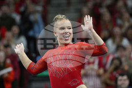 FILE - Arkansas gymnast Joscelyn Roberson competes on the floor against LSU during an NCAA gymnastics meet on Jan. 24, 2025, in Fayetteville, Ark. (AP Photo/Michael Woods, file)
