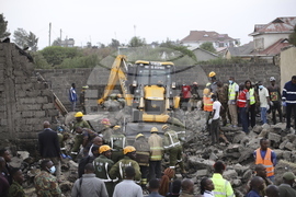 Firefighters search near the debris at the site of an airplane belonging to the African Medical and Research Foundation (AMREF) that crashed into a residential building in the Mwihoko area of Ruiru, in Kiambu County, Kenya, Wednesday, Aug. 7, 2024. (AP Photo/Patrick Ngugi)