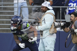 Former NFL player Marshawn Lynch reacts after Seattle Seahawks running back George Holani (36) ran into him after Holani scored a touchdown during the first half of an NFL preseason football game against the Las Vegas Raiders, Thursday, Aug. 7, 2025, in Seattle. (AP Photo/Lindsey Wasson)
