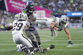 Seattle Seahawks running back George Holani (36) scores a touchdown past Las Vegas Raiders safety Isaiah Pola-Mao (20) during the first half of an NFL preseason football game Thursday, Aug. 7, 2025, in Seattle. (AP Photo/Maddy Grassy)