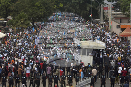 Hundreds of supporters of the opposition PPA-CI and PDCI protest, calling for electoral reforms and the inclusion of Laurent Gbagbo, Tidjane Thiam, Soro Guillaume and Blé Goudé on the ballot in Abidjan, Ivory Coast, Saturday, Aug. 9, 2025. (AP Photo/Diomande Ble Blonde)