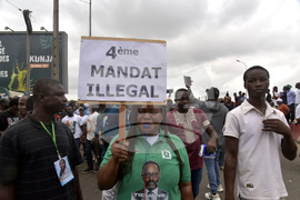 Demonstrators hold placards during a protest in Abidjan, Ivory Coast, Saturday, Aug. 9, 2025. (AP Photo/Diomande Ble Blonde)