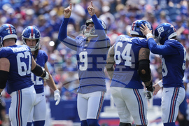 New York Giants place kicker Graham Gano (9) celebrates after kicking a field goal during the first half of an NFL preseason football game against the Buffalo Bills Saturday, Aug. 9, 2025, in Orchard Park, N.Y. (AP Photo/Seth Wenig)