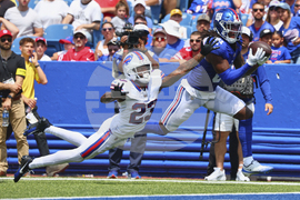 New York Giants wide receiver Lil'Jordan Humphre, right, catches a pass for a touchdown over Buffalo Bills' Dane Jackson (23) during the first half of an NFL preseason football game Saturday, Aug. 9, 2025, in Orchard Park, N.Y. (AP Photo/Jeffrey T. Barnes)