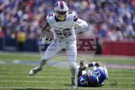 Buffalo Bills Ty Johnson (26) breaks a tackle by New York Giants' Raheem Layne (43) during the first half of an NFL preseason football game Saturday, Aug. 9, 2025, in Orchard Park, N.Y. (AP Photo/Seth Wenig)