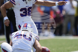 Buffalo Bills' Caden Davis (36) kicks a field goal during the first half of an NFL preseason football game against the New York Giants Saturday, Aug. 9, 2025, in Orchard Park, N.Y. (AP Photo/Seth Wenig)