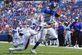 Buffalo Bills Tre'Davious White (27) tackles New York Giants' Zach Pascal (83) during the first half of an NFL preseason football game Saturday, Aug. 9, 2025, in Orchard Park, N.Y. (AP Photo/Jeffrey T. Barnes)
