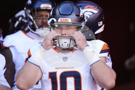 Denver Broncos quarterback Bo Nix (10) prepares to enter the field before a preseason NFL football game against the San Francisco 49ers, Saturday, Aug. 9, 2025, in Santa Clara, Calif. (AP Photo/Godofredo A. Vásquez)