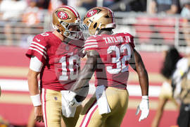 San Francisco 49ers quarterback Mac Jones (10) celebrates a rushing touchdown by running back Patrick Taylor Jr. (32) during the first half of a preseason NFL football game against the Denver Broncos, Saturday, Aug. 9, 2025, in Santa Clara, Calif. (AP Photo/Godofredo A. Vásquez)
