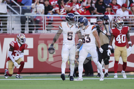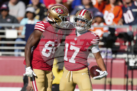 San Francisco 49ers wide receiver Jordan Watkins (17 celbrates his catch with wide receiver Russell Gage Jr. (84) during the first half of a preseason NFL football game against the Denver Broncos, Saturday, Aug. 9, 2025, in Santa Clara, Calif. (AP Photo/Godofredo A. Vásquez)