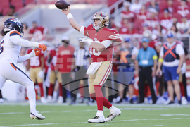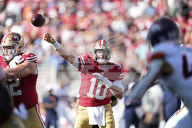 San Francisco 49ers Mac Jones (10) throws in the first half of a NFL football game against the Denver Broncos at Levi's Stadium in Santa Clara, Calif., on Saturday, Aug. 9, 2025. (Carlos Avila Gonzalez/San Francisco Chronicle via AP)