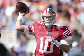 San Francisco 49ers quarterback Mac Jones (10) throws a pass during the first half of a preseason NFL football game against the Denver Broncos, Saturday, Aug. 9, 2025, in Santa Clara, Calif. (AP Photo/Kelley L Cox)