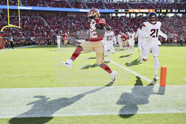 San Francisco 49ers Jordan Watkins (17) runs after a catch in the second half during a NFL football game against the Denver Broncos at Levi's Stadium in Santa Clara, Calif., on Saturday, Aug. 9, 2025. (Carlos Avila Gonzalez/San Francisco Chronicle via AP)