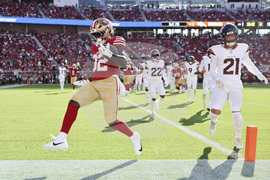 San Francisco 49ers wide receiver Jordan Watkins (17) runs past Denver Broncos safety Talanoa Hufanga (9) during the first half of a preseason NFL football game Saturday, Aug. 9, 2025, in Santa Clara, Calif. (AP Photo/Godofredo A. Vásquez)