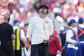 San Francisco 49ers head coach Kyle Shanahan walks on the sideline during the first half of a preseason NFL football game against the Denver Broncos, Saturday, Aug. 9, 2025, in Santa Clara, Calif. (AP Photo/Godofredo A. Vásquez)