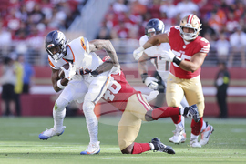 Denver Broncos wide receiver Courtland Sutton (14) is tackled by San Francisco 49ers linebacker Tatum Bethune (48) during the first half of a preseason NFL football game Saturday, Aug. 9, 2025, in Santa Clara, Calif. (AP Photo/Kelley L Cox)