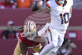 San Francisco 49ers cornerback Darrell Luter Jr. (28) breaks up a pass intended for Denver Broncos wide receiver Courtland Sutton (14) during the first half of a preseason NFL football game Saturday, Aug. 9, 2025, in Santa Clara, Calif. (AP Photo/Kelley L Cox)