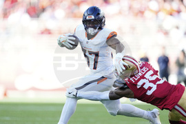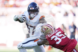 Denver Broncos running back RJ Harvey (37) is tackled by San Francisco 49ers linebacker Tatum Bethune (48) during the first half of a preseason NFL football game Saturday, Aug. 9, 2025, in Santa Clara, Calif. (AP Photo/Kelley L Cox)