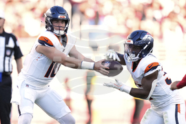 Denver Broncos quarterback Bo Nix (10) hands off to running back RJ Harvey (37) during the first half of a preseason NFL football game against the San Francisco 49ers, Saturday, Aug. 9, 2025, in Santa Clara, Calif. (AP Photo/Godofredo A. Vásquez)