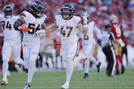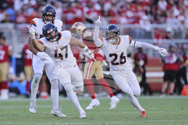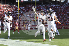 Denver Broncos linebacker Karene Reid (47) celebrates after intercepting a pass during the first half of a preseason NFL football game against the San Francisco 49ers, Saturday, Aug. 9, 2025, in Santa Clara, Calif. (AP Photo/Kelley L Cox)