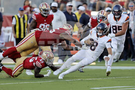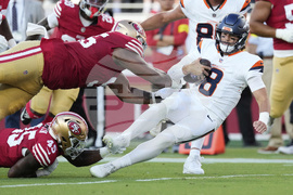 Broncos quarterback Jarrett Stidham (8) is tackled after a scramble in the first half during a NFL football game against San Francisco 49ers at Levi's Stadium in Santa Clara, Calif., on Saturday, Aug. 9, 2025. (Carlos Avila Gonzalez/San Francisco Chronicle via AP)