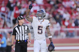 Denver Broncos wide receiver Trent Sherfield Sr. (5) celebrates after a touchdown catch during the first half of a preseason NFL football game San Francisco 49ers, Saturday, Aug. 9, 2025, in Santa Clara, Calif. (AP Photo/Kelley L Cox)