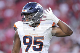 Denver Broncos defensive end Sai'vion Jones (95) reacts after recovering a fumble during the second half of a preseason NFL football game against the San Francisco 49ers, Saturday, Aug. 9, 2025, in Santa Clara, Calif. (AP Photo/Kelley L Cox)