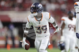 Denver Broncos cornerback Joshua Pickett (39) intercepts a pass during the second half of a preseason NFL football game against the San Francisco 49ers, Saturday, Aug. 9, 2025, in Santa Clara, Calif. (AP Photo/Kelley L Cox)